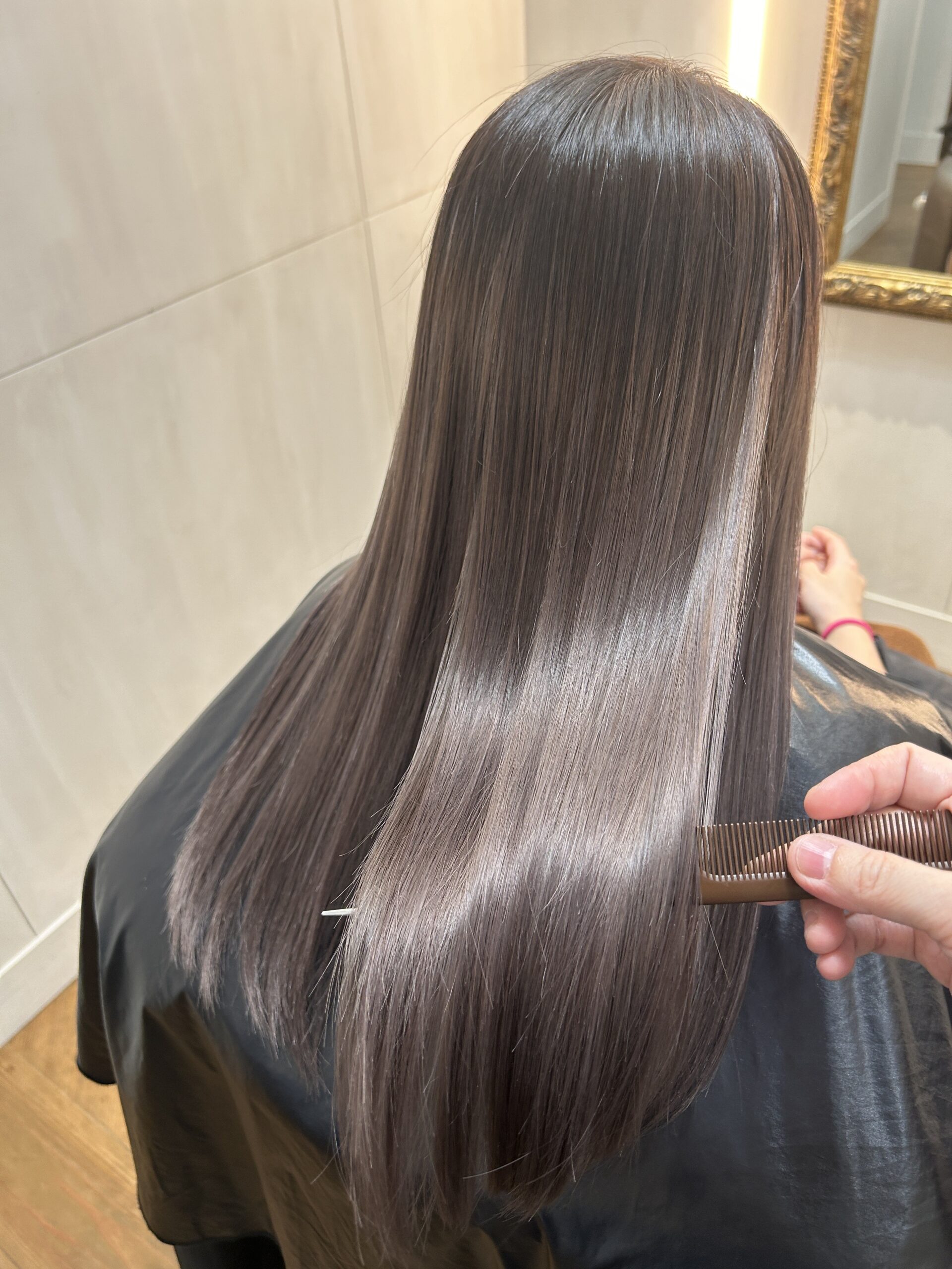 髪を傷ませずに健康的な艶髪になれるストレートを実現。ストレートをしたとは思えない質感と手触りで自然で柔らかい質感が特徴です。ストレートをやると、ツンツンした仕上がりでぺったんこになってしまいがちですが、髪質改善専用の薬剤で癖やエイジング毛を優しく伸ばして行くため、弾力ある透明どの高い艶を実現します。